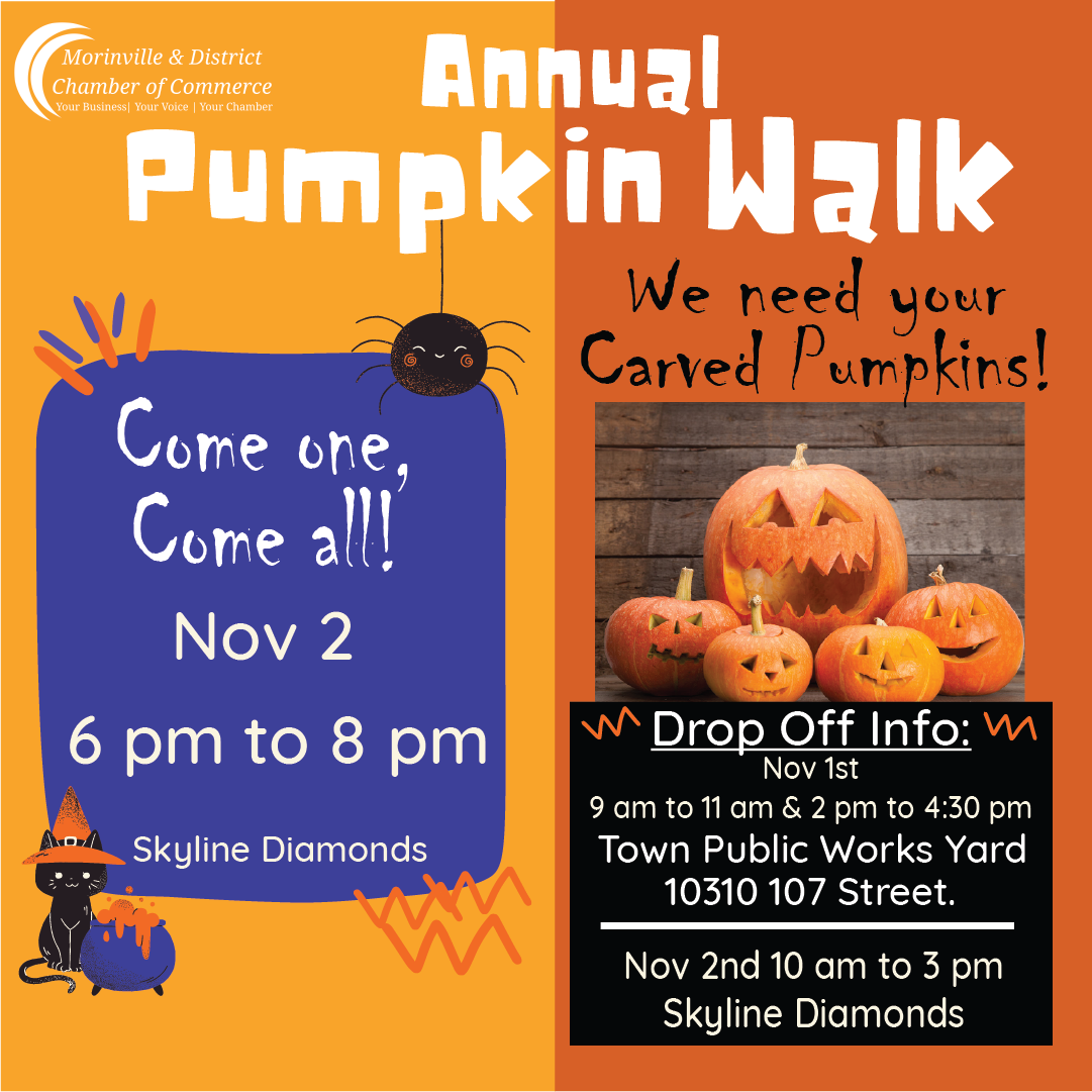 Morinville & District Chamber of Commerce is excited to present the 2nd Pumpkin Walk Event in Morinville. We'd like to invite you to come for a stroll and check out all the spooky and unique jack-o-lanterns that have been donated. Come one, Come all on Tuesday, Nov 2nd from 6:00 pm - 8:00 pm at the Morinville Skyline Baseball Diamonds.